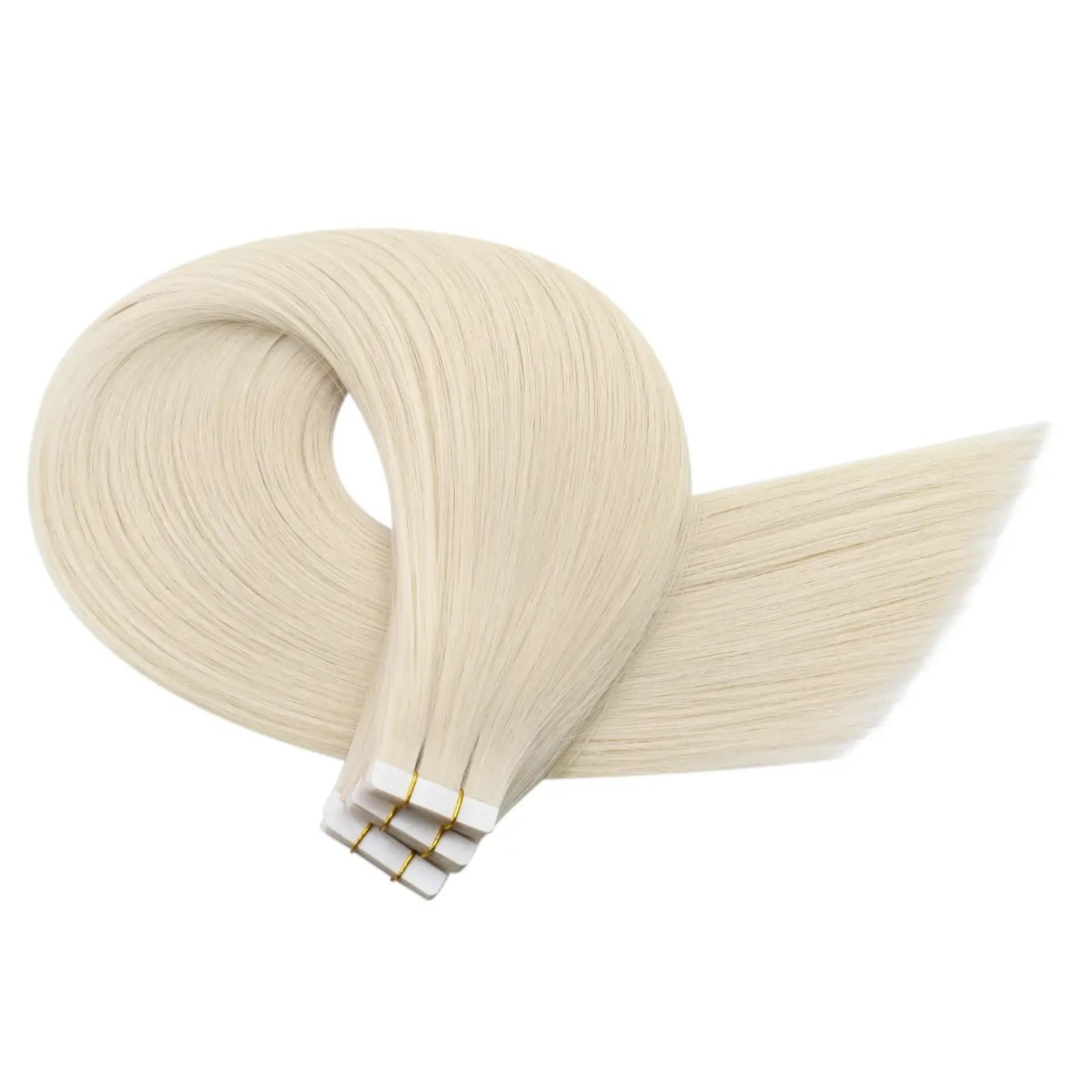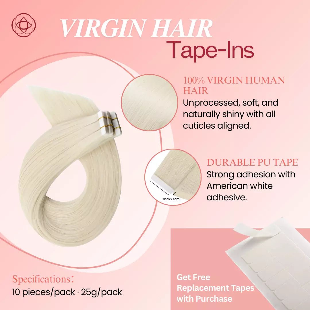 100% Virgin Human Hair Extensions Tape Ins Light Blonde (#60) are premium virgin tape-in hair extensions created for a smooth, natural appearance. Made from 100% virgin human hair, these extensions retain their original cuticle integrity for soft texture, consistent thickness, and long-lasting quality. The thin tape design allows the hair to lay flat and blend naturally with your own hair.